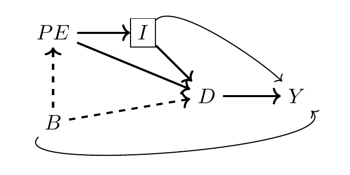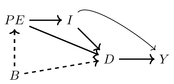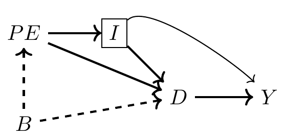Here, \(D\) is college education, \(Y\) is earnings, \(PE\) be parental education, \(I\) is family income, \(B\) are unobserved background factors such as ability.