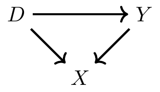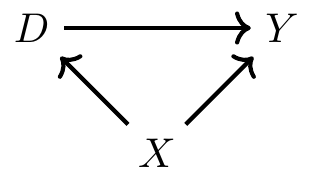 - We call \(X\) a confounder because it is a common cause of \(D\) and \(Y\).