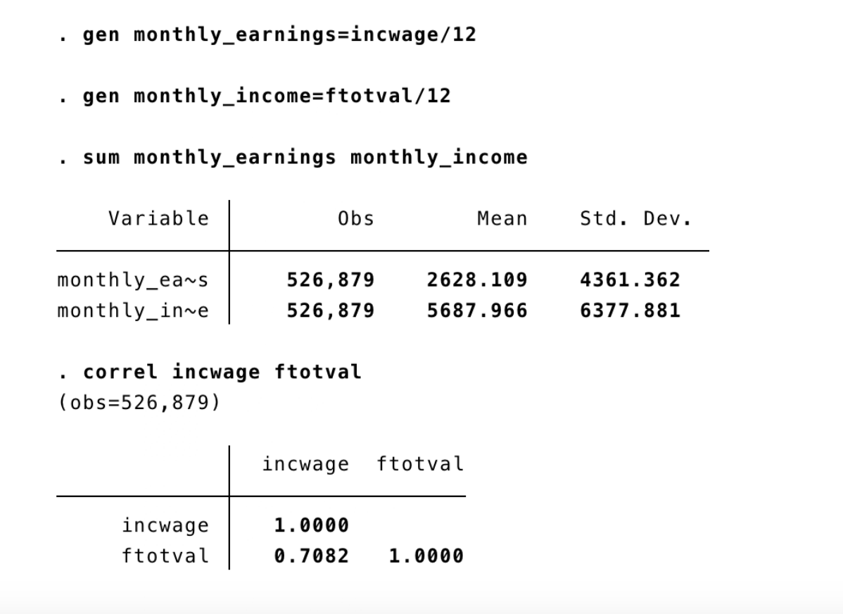 If we think that monthly earnings and monthly income are highly correlated, we can first check their correlation